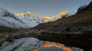 まだ暗い早朝5時、ヘッドランプをつけてABCへ出発。湖面に映る逆さアンナプルナ、黄金色のモルゲンロート…標高4130mで出会った景色は、言葉を失うほどの美しさでした。トレッキング4日目の感動をお届けします。
