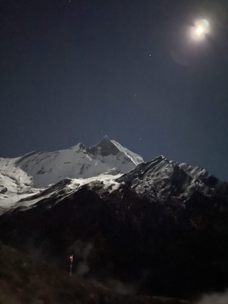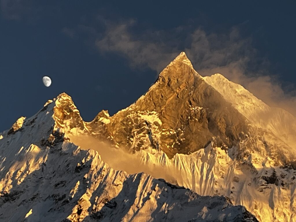 夕日に照らされるマチャプチャレと月