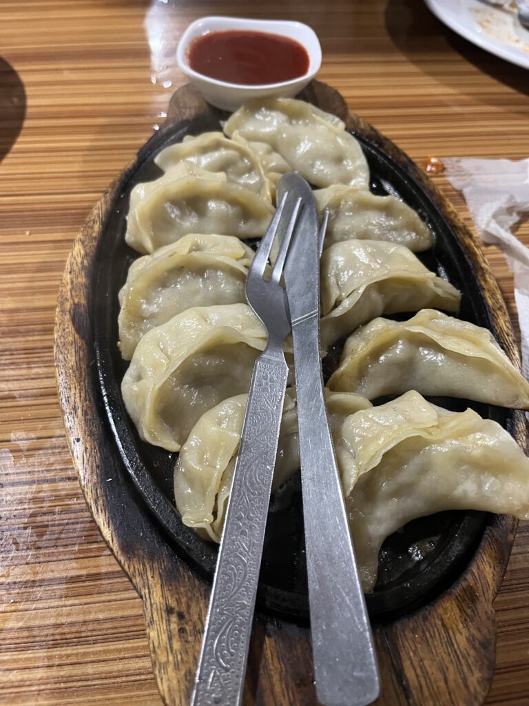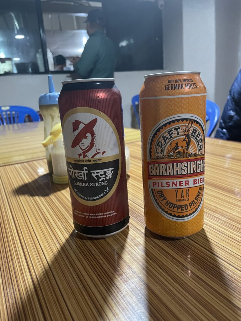 トレッキング最後の夜、もう高山病の心配もないので心置きなくビールで乾杯!!&餃子のような「モモ」、ここのロッジのご飯はレベルが高かった!デザートにケーキまで食べちゃいました^^
