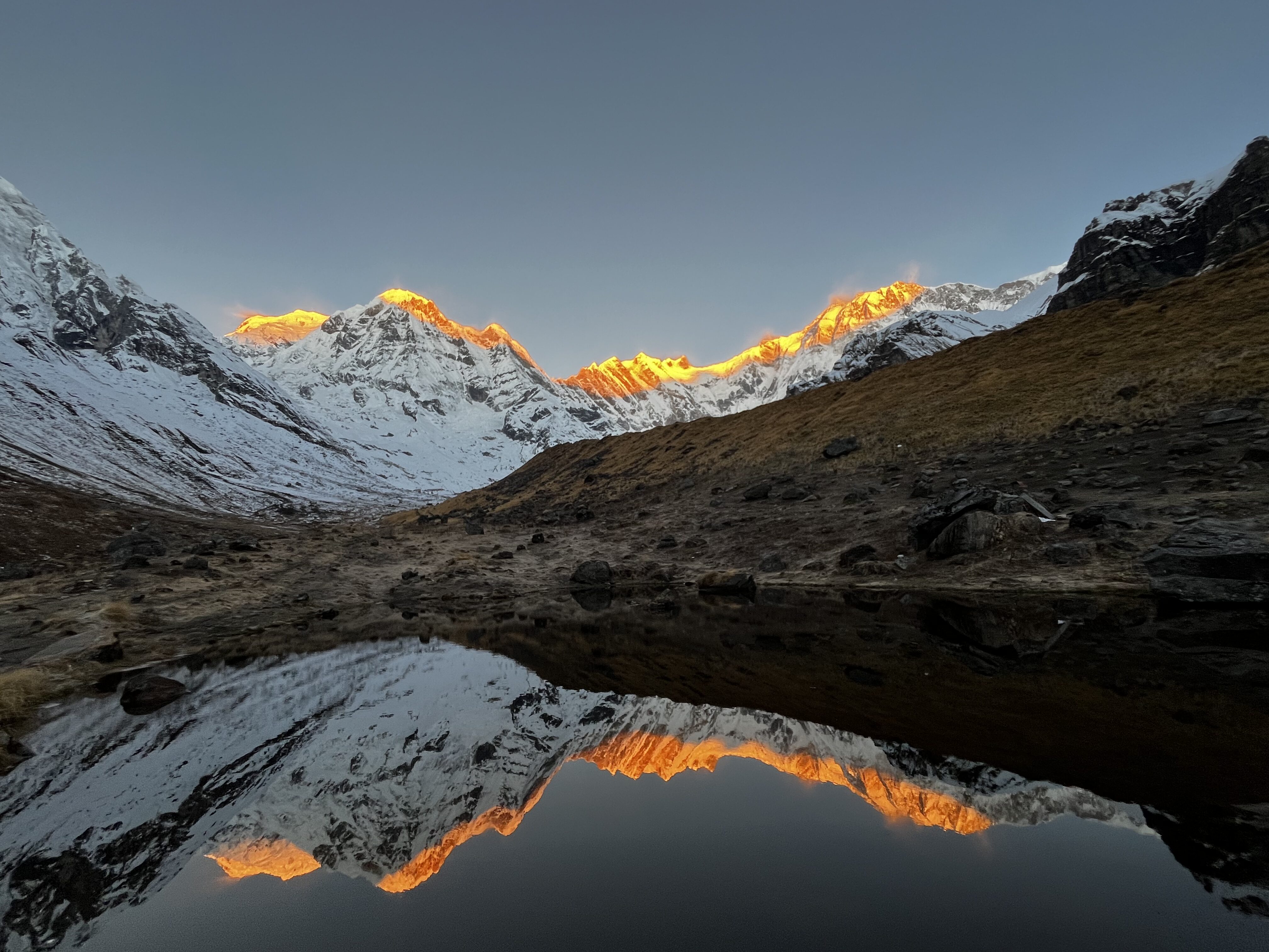 暗闇の中を歩いて迎えた夜明け、湖に映る逆さアンナプルナ、そして4130mのABC到達。この日の景色は、一生忘れられないものになりました。