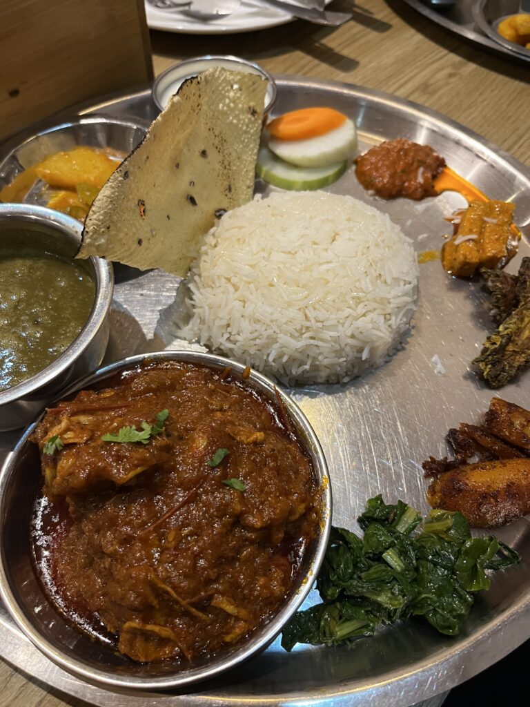 最後の夜、カトマンズで一番美味しいと言われるダルバートのお店へ。トレッキング中に何度も食べたダルバートですが、ここのは違いました!チキンカリーが付いてて豪華!ちなみにダルバートはダル(豆)のスープを野菜のトッピングと一緒にご飯に混ぜて食べる、日本で言うとお味噌汁のようなもので、これが本当に美味しかった!ここは特別にカリーが付いていたけど、いわゆるカレーとは違い、もっと優しいお味です。しかも、このダルバート、ご飯もトッピングも全てお代わり自由。何度も店員さんが注ぎに来てくれます笑。そして食べ過ぎる。山の中で食べたダルバートも十分美味しかったです。そして安い!!庶民の通うお店なら300円くらいで食べられるそうです。この高級なお店でも700円くらいだったような…