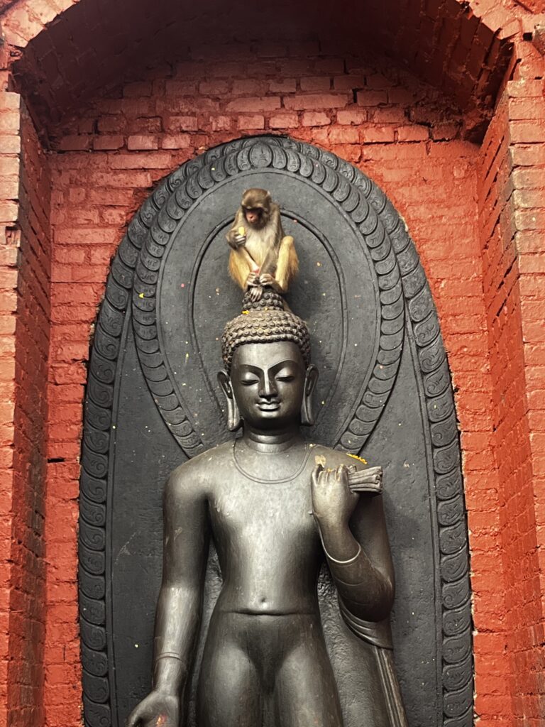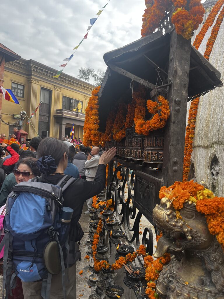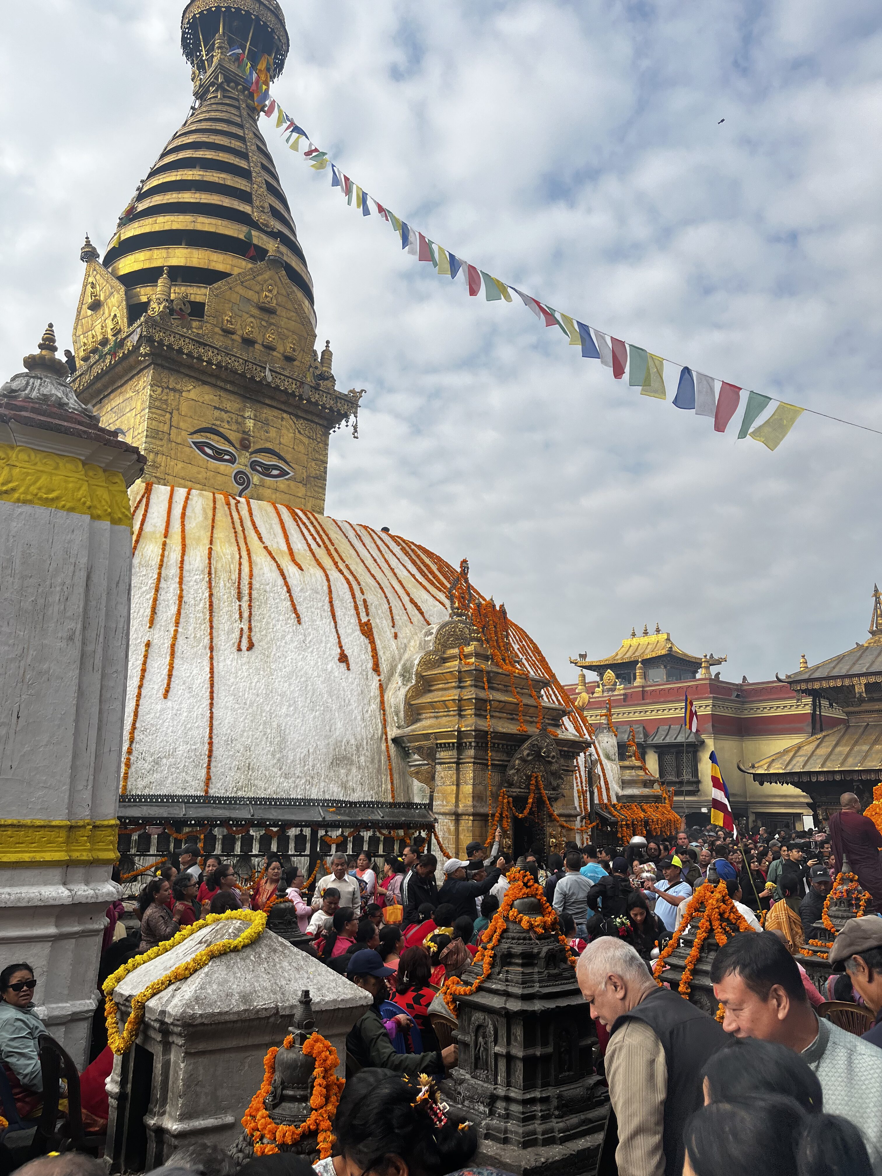 帰国便は深夜なので、最終日丸一日はカトマンズ観光へ。まずは世界遺産「スワヤンブナート寺院」別名モンキーテンプル。お猿さん達が縦横無尽に駆け回ってました。ちょうど何かのお祭りだったようで、すごい人!ブッダの知恵の眼の周りにもお花が散りばめられ、お坊さん?達のお説法があったり、お茶やお菓子を配ってお接待があり、貴重な光景を見ることができネパール人の信心深さを肌で感じました。