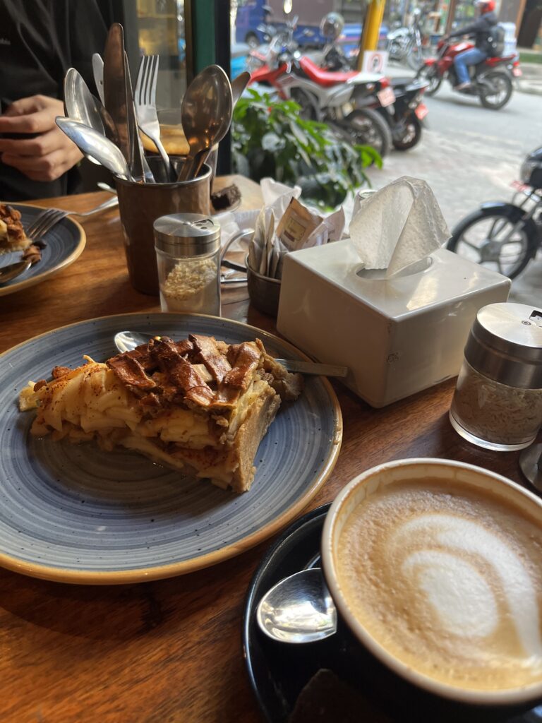 タメル地区までは車、バイク、人が入り乱れ道路の状態も良くないので、排気ガスと土埃で空気が悪く疲れたので、オシャレカフェで一息。甘さ控えめのアップルパイが美味!コーヒーも美味しかったです。